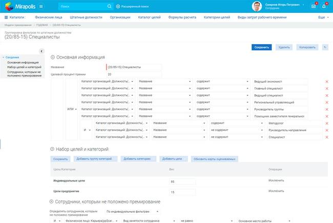- Настройка правил премирования для разных категорий сотрудников с помощью конструктора системы