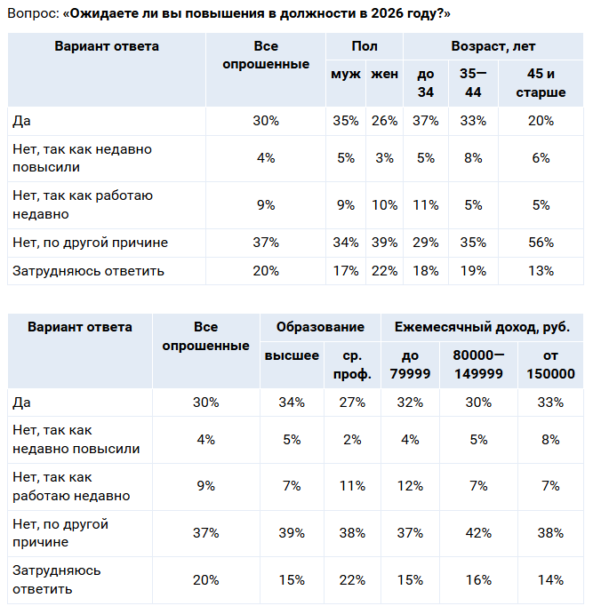 Образование тоже влияет на ожидания. Обладатели высшего образования чаще настроены на карьерный рост (34%), чем те, у кого среднее профессиональное (27%).