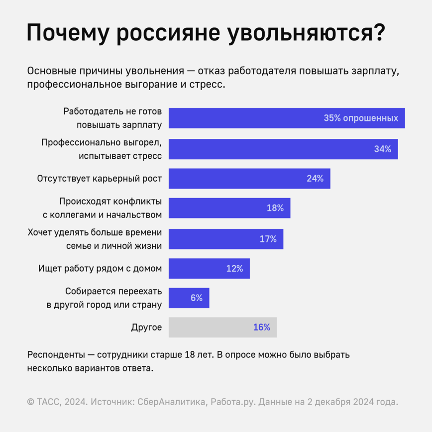 35% — отказ повысить зарплату. Когда сотрудник видит, что его труд недооценен, а просьбы о пересмотре компенсации игнорируются.