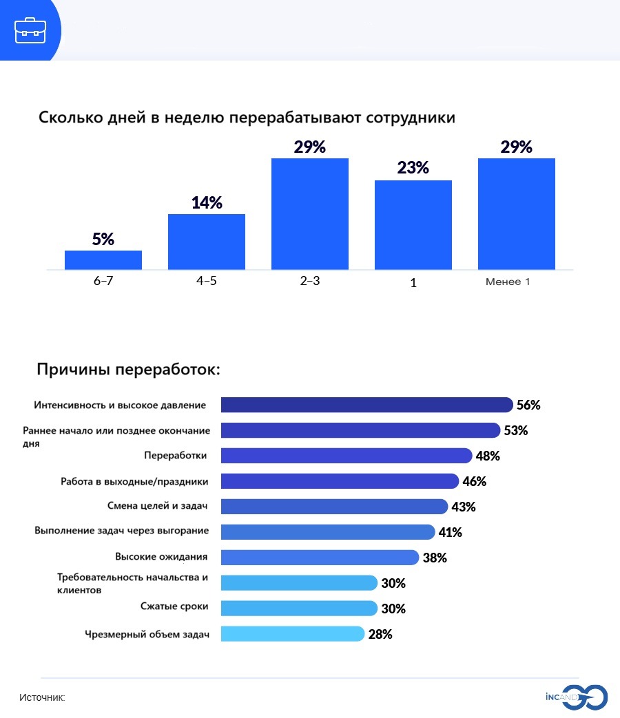 Почти половина работников российских компаний — 45%, по данным исследования MANGO OFFICE, регулярно жалуются на стресс из-за переработок. Однако 83% компаний признаются, что толком не измеряют реальную загруженность персонала. Решения принимаются на основе того, кто чаще попадается на глаза на созвонах или кто задерживается в офисе. Такой подход приводит к тому, что одни люди тихо выгорают, другие откровенно скучают, а команда в целом работает далеко не на полную мощность.